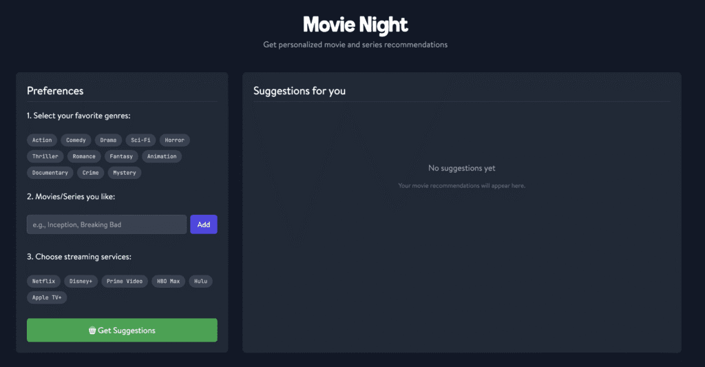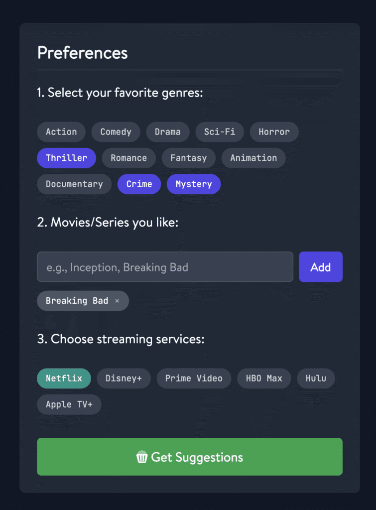 As an AI Chatbot I decided to go for Gemini 2.0. Next, I decided to ask the user about favorite genres and favorite movies/series, so I can incorporate those into the prompt. Of course, with the text that it may not recommend that favorite film/series.